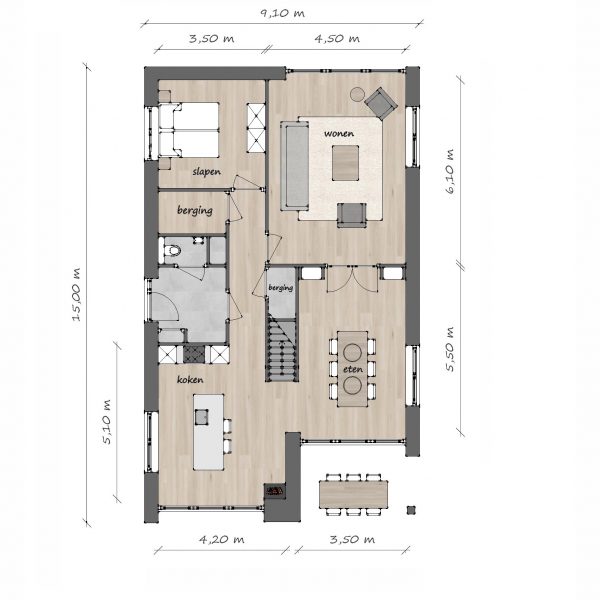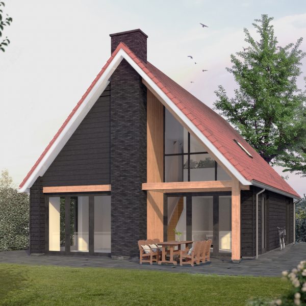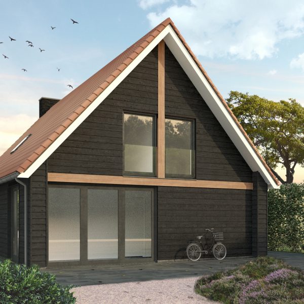 Lange Jaap is een schuurwoning met een (zoals de naam al doet vermoeden) lange basisvorm. Lange Jaap B is uitgevoerd in een stoere zwarte kleur in combinatie met warme houten kolommen. De achtergevel wordt gekenmerkt door een grote glaspartij omringt door warme materialen. De indeling is licht en speels te noemen met een trap als eyecatcher in de woonkamer, woonruimtes die open zijn tot in de nok en een doorkijk van de verdieping naar de woonkamer. Door de mogelijkheid om op de begane grond een ruime slaapkamer met badkamer te realiseren is dit type heel geschikt als levensloop bestendig huis. Op de verdieping is ruimte voor twee of drie ruime slaapkamers of een werkplek en een badkamer.
