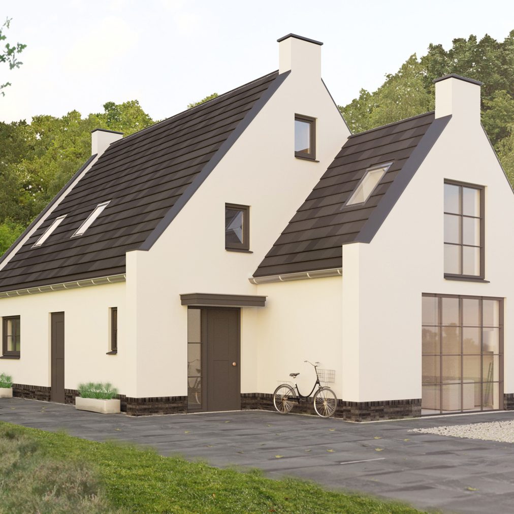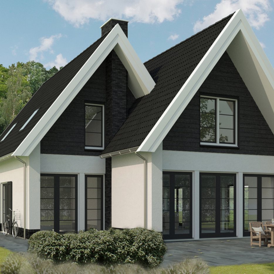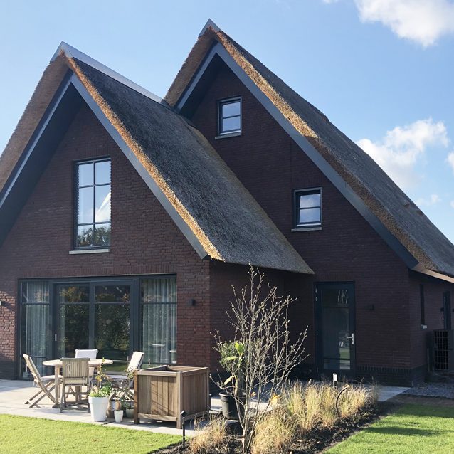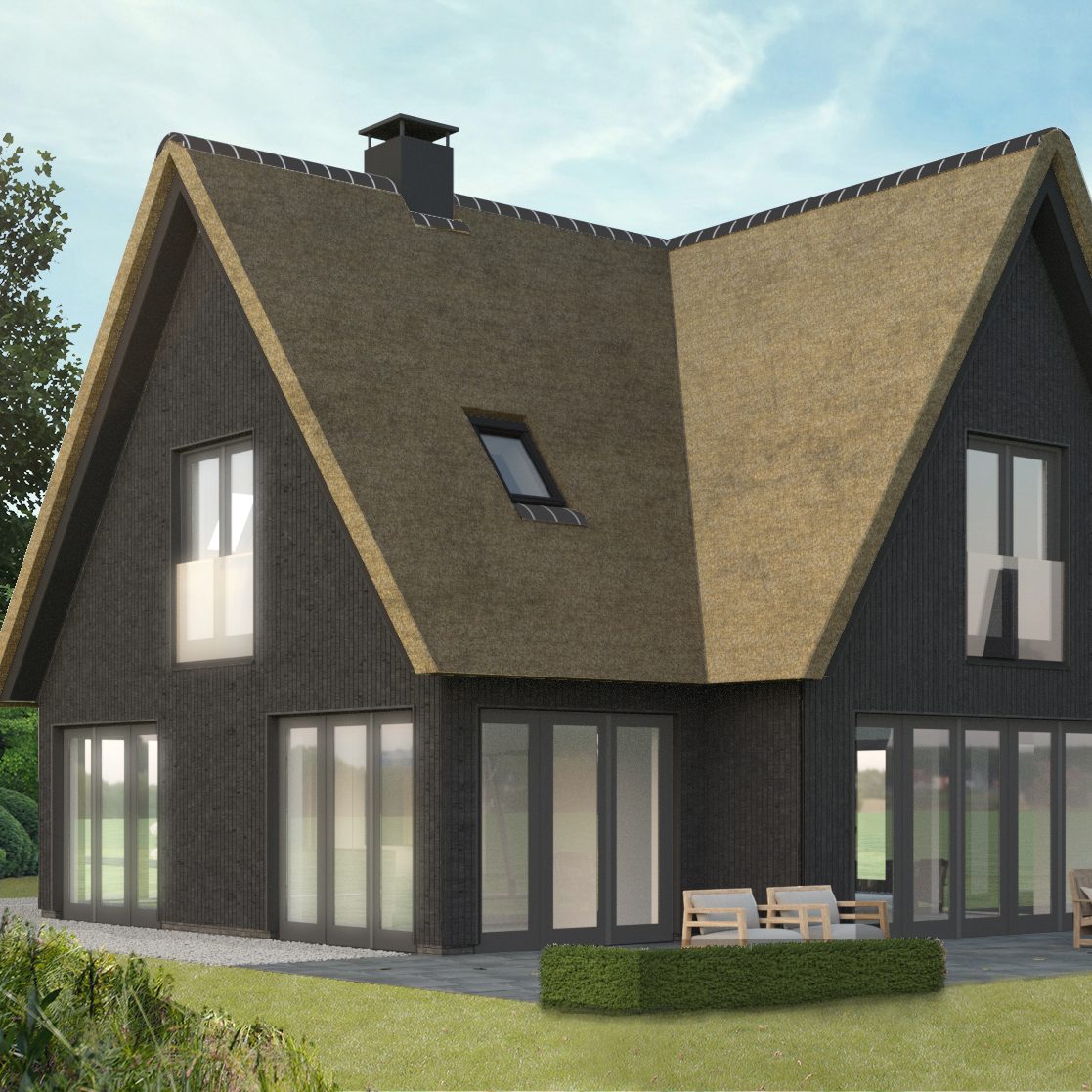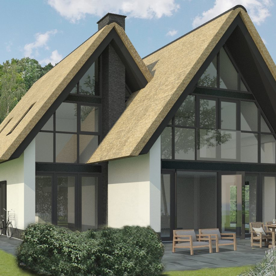 Deze modern landelijke villa in Nijmegen is opgebouwd uit een hoofdvorm met een puntdak en een kleinere massa met puntdak hier tegenaan. Dit zorgt voor een vriendelijk aanzicht en maakt het ontwerp net even anders. Het huis heeft veel mooie grote ramen rondom en een warme landelijke uitstraling met een witte gevel met contrasterende donkere ramen en een rieten kap.