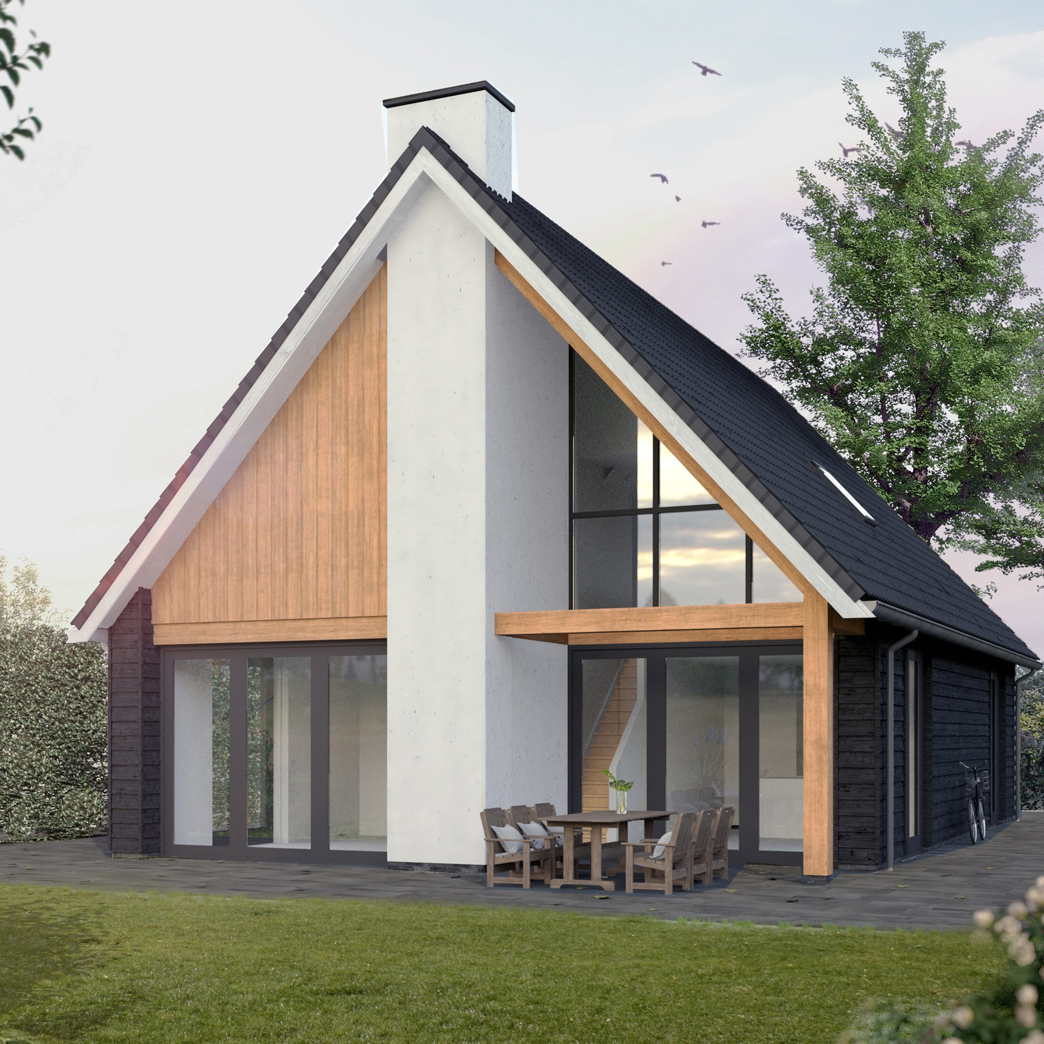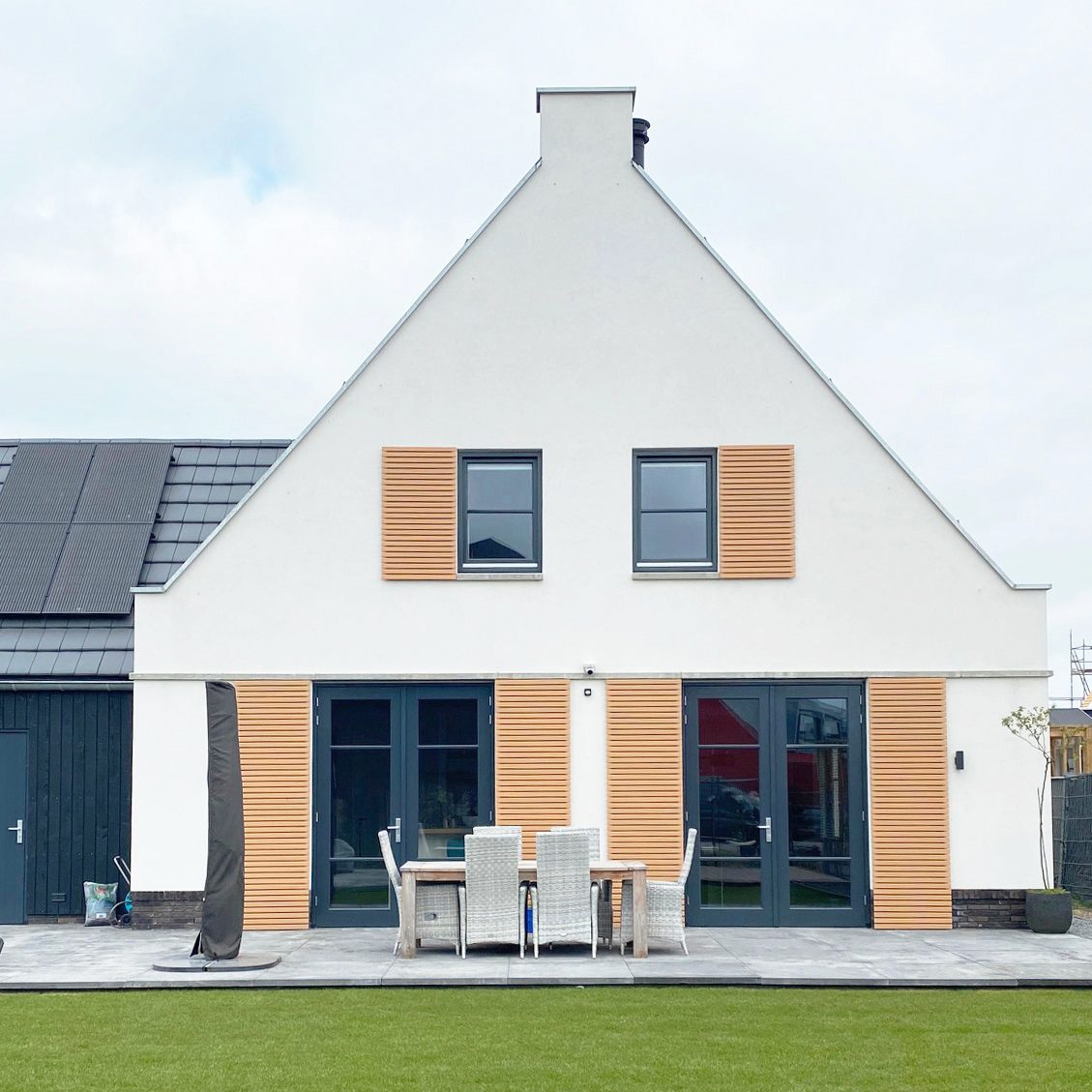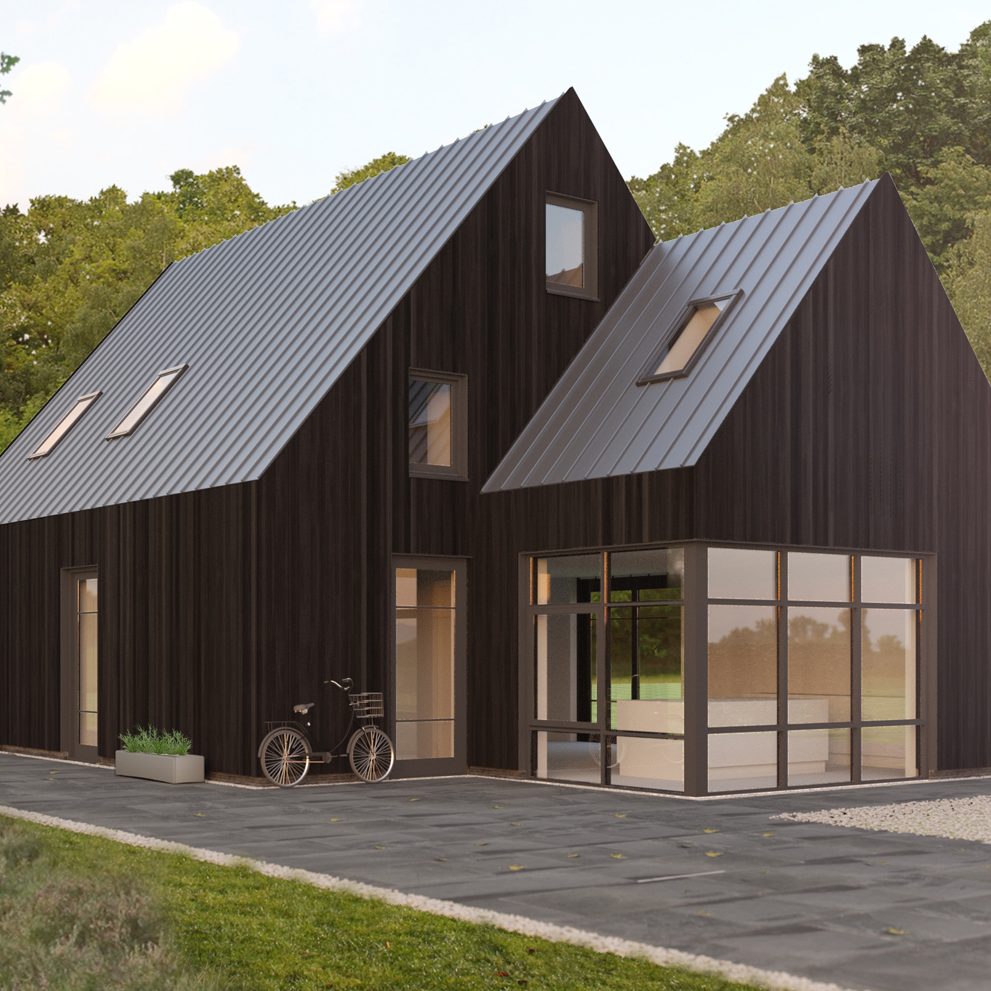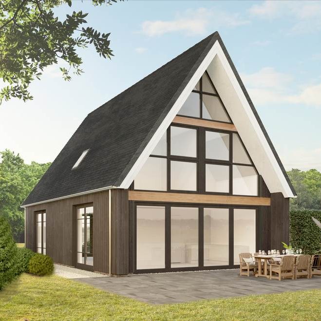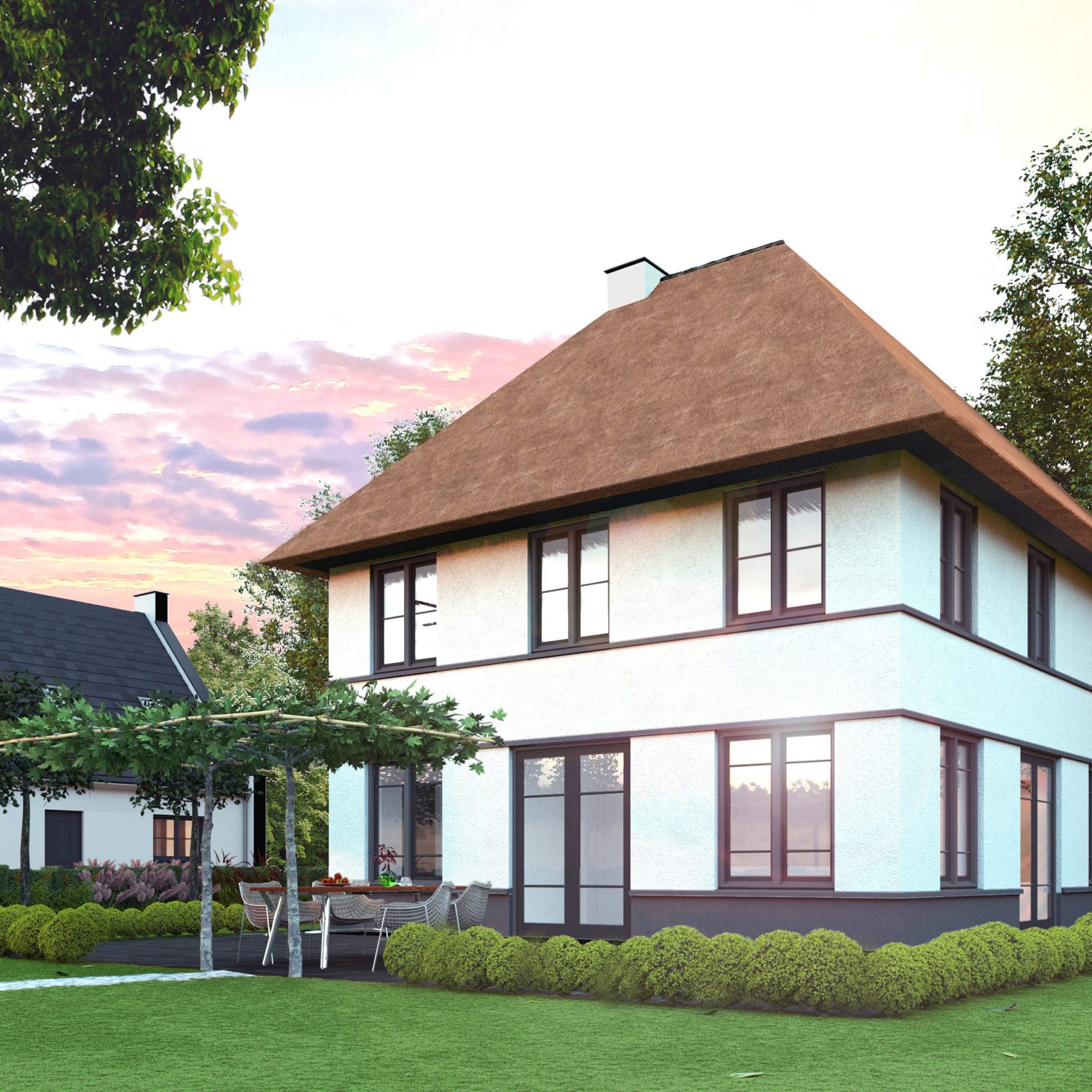 Deze modern landelijke villa in Nijmegen is opgebouwd uit een hoofdvorm met een puntdak en een kleinere massa met puntdak hier tegenaan. Dit zorgt voor een vriendelijk aanzicht en maakt het ontwerp net even anders. Het huis heeft veel mooie grote ramen rondom en een warme landelijke uitstraling met een witte gevel met contrasterende donkere ramen en een rieten kap.