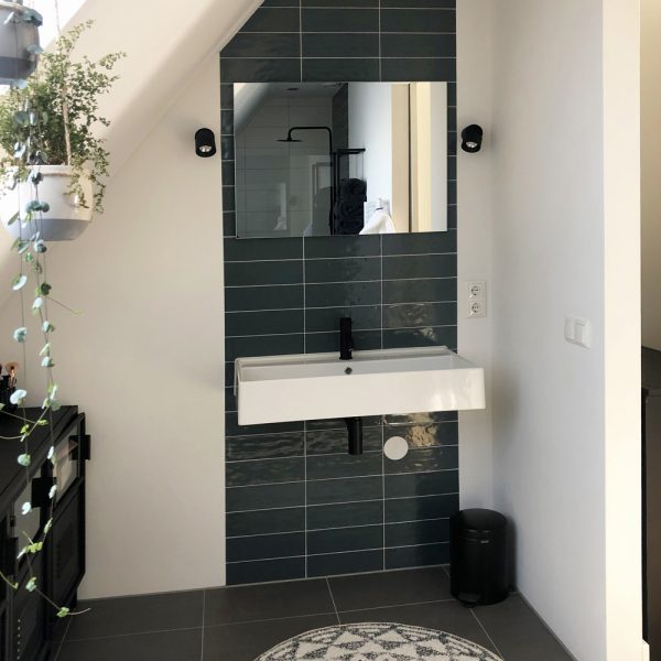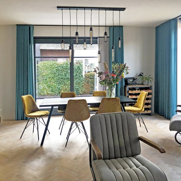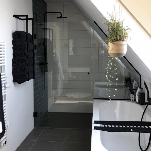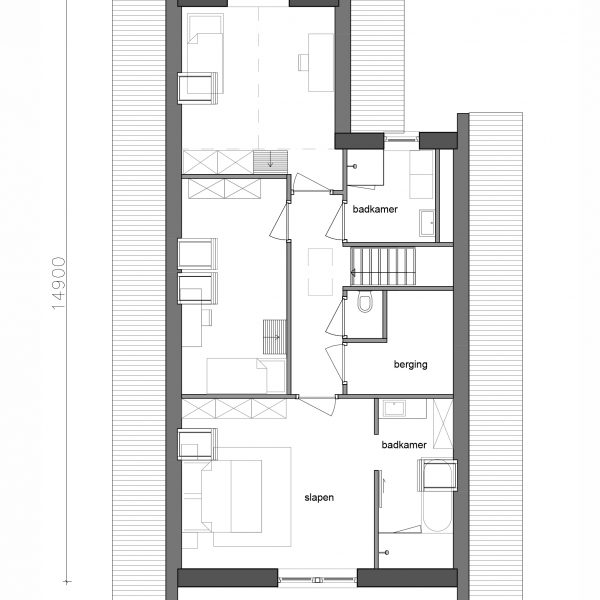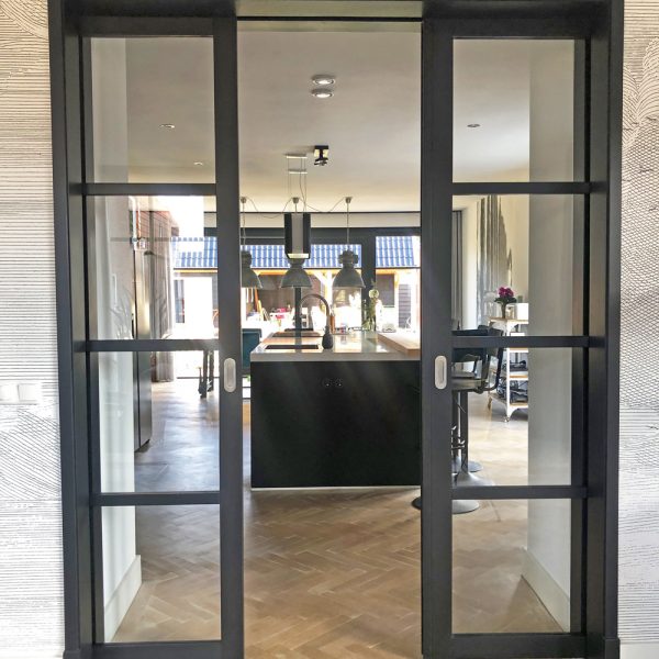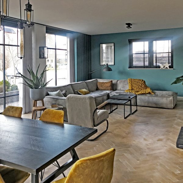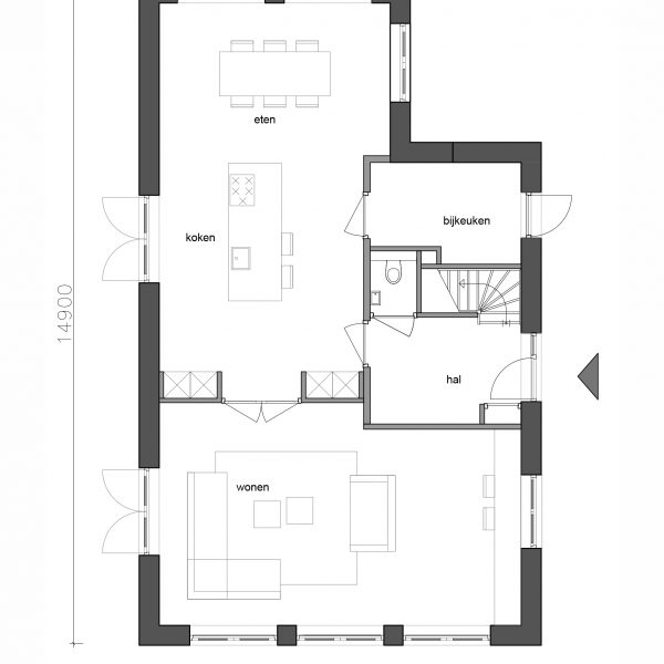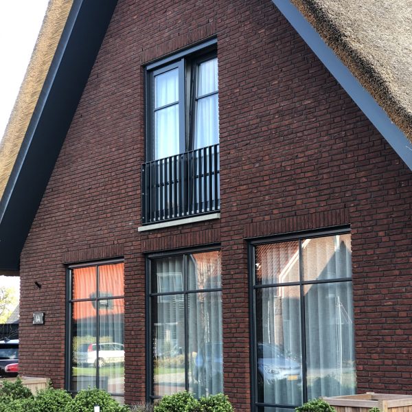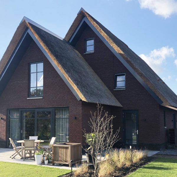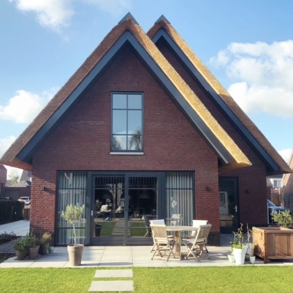 Dit moderne ontwerp van rode baksteen en riet heeft een stoer uiterlijk gekregen door stoere grijze strakke ramen en deuren en door een moderne zwarte nok op het riet. De rode baksteen contrasteert mooi met het grijs van de kozijnen en het riet van de kap. De kleinere massa aan de achterkant van het huis breekt het ontwerp en maakt het wat zachter.