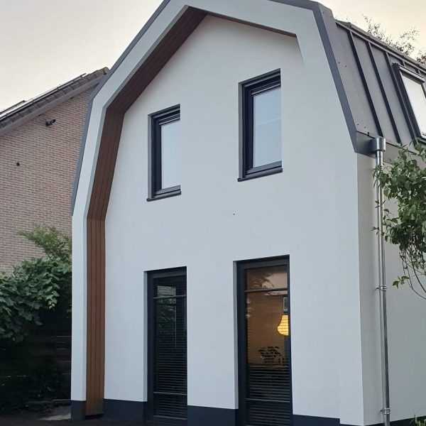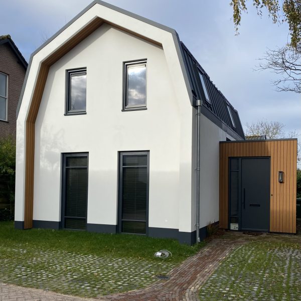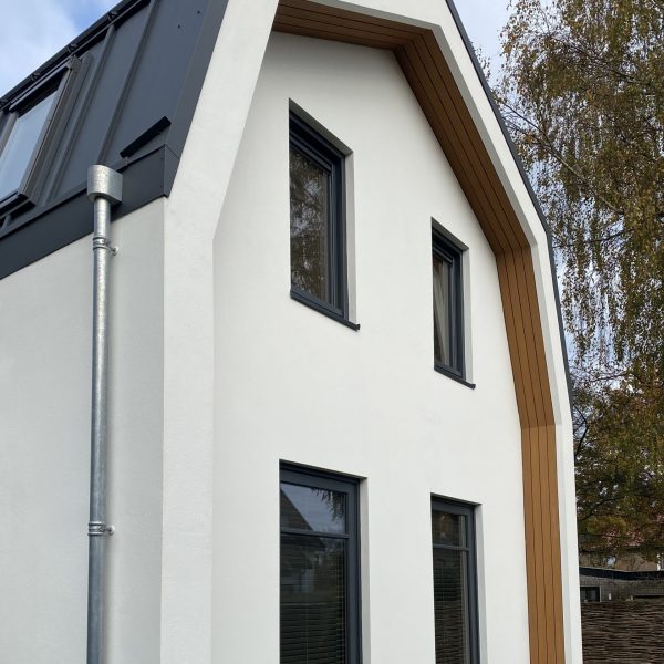 In een wijkje van het centrum van Soest met historische huizen, voorzien van een mansardedak, hebben we dit moderne huis ontworpen. De vorm van het huis verwijst naar zijn omgeving maar dan in een moderne uitvoering. Het zinken dak, de verholen goot en het houten plafond onder het overstek geven het huis een heel eigentijdse uitstraling.