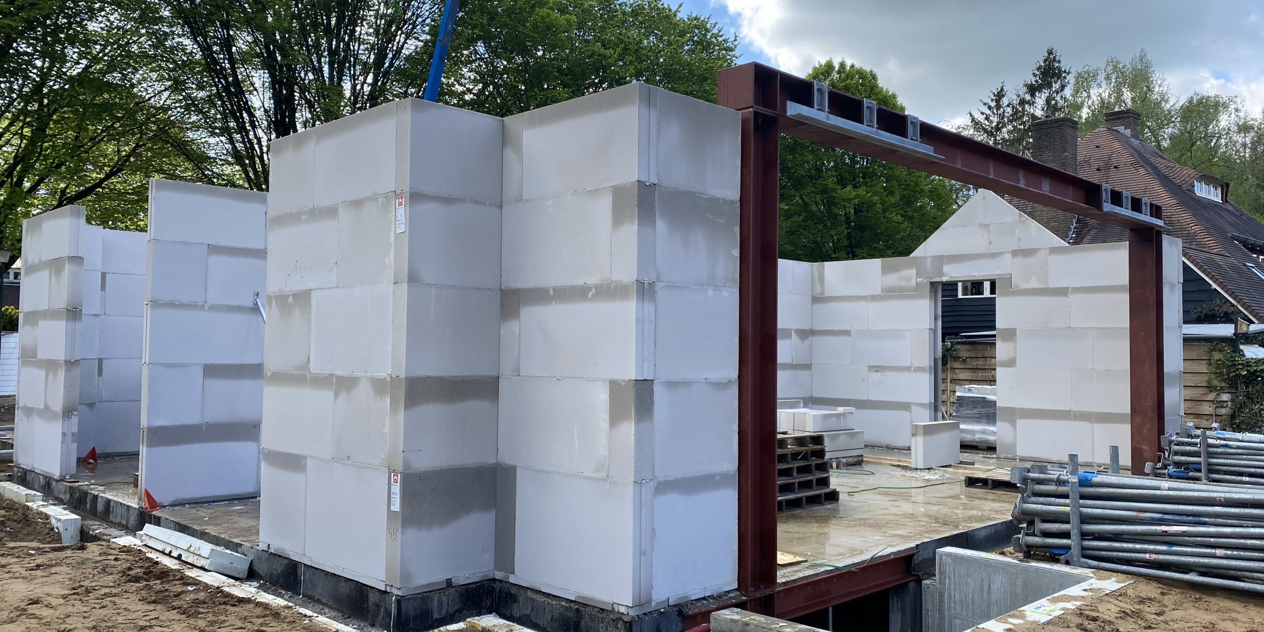 Het stalen portaal in de achtergevel wordt geplaatst om straks vorm te geven aan de grote glazen achterpui.